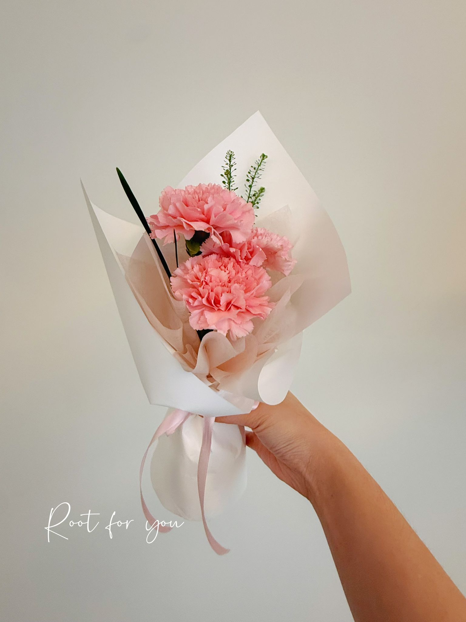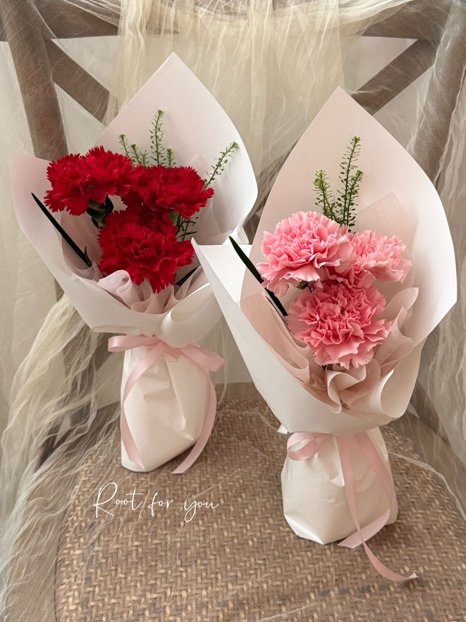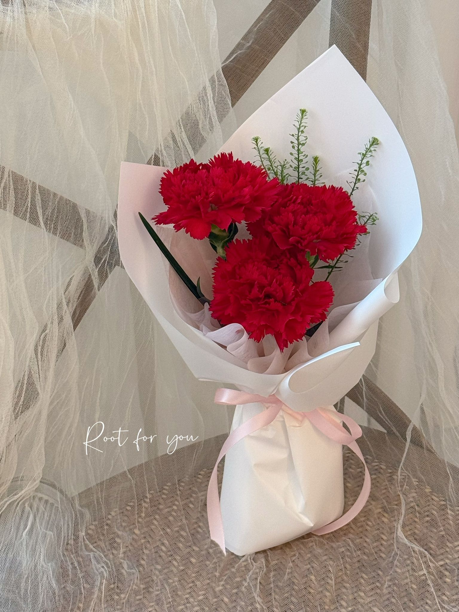 Featuring 3 premium carnations in your choice of soft pink or classic red, this bouquet is thoughtfully styled in an elegant Korean-inspired wrapping — clean, airy, and effortlessly refined.