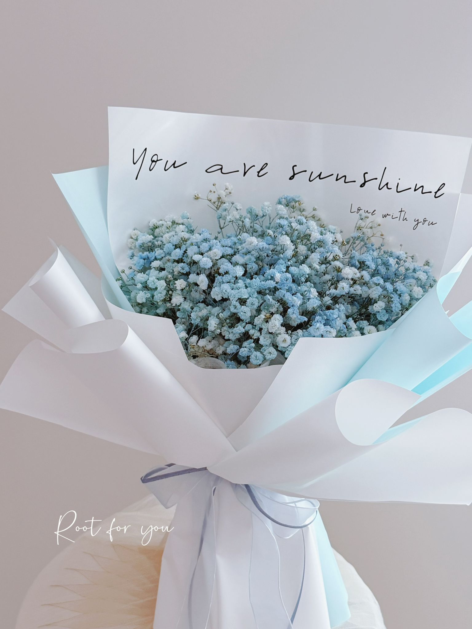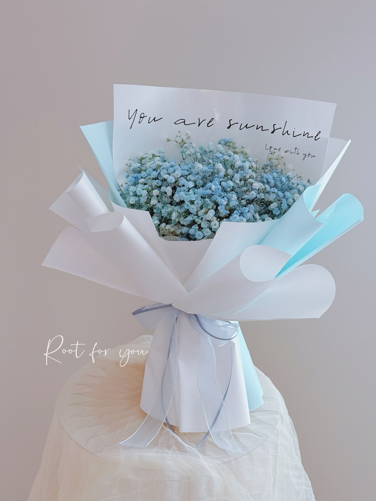 A cloud of delicate baby’s breath in soft hues of light blue and blush pink, gently wrapped to create a dreamy, airy silhouette.